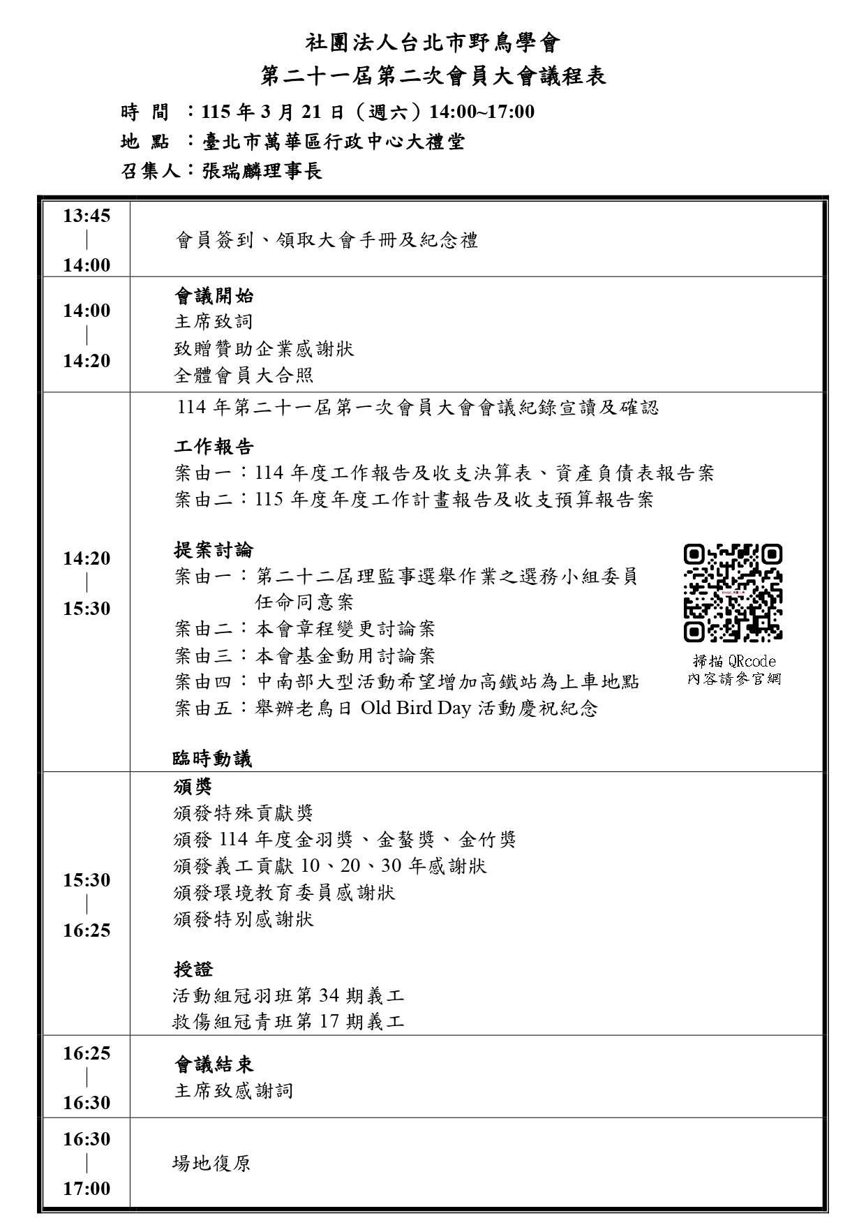 感謝您對台北鳥會長期的付出與支持。本會將於 115年3月21日星期六 召開第二十一屆第二次會員大會,向您報告114年經營成果和未來計畫。請會員攜帶身分證或會員證,誠摯邀請您出席,台北鳥會未來,需要有您參與!