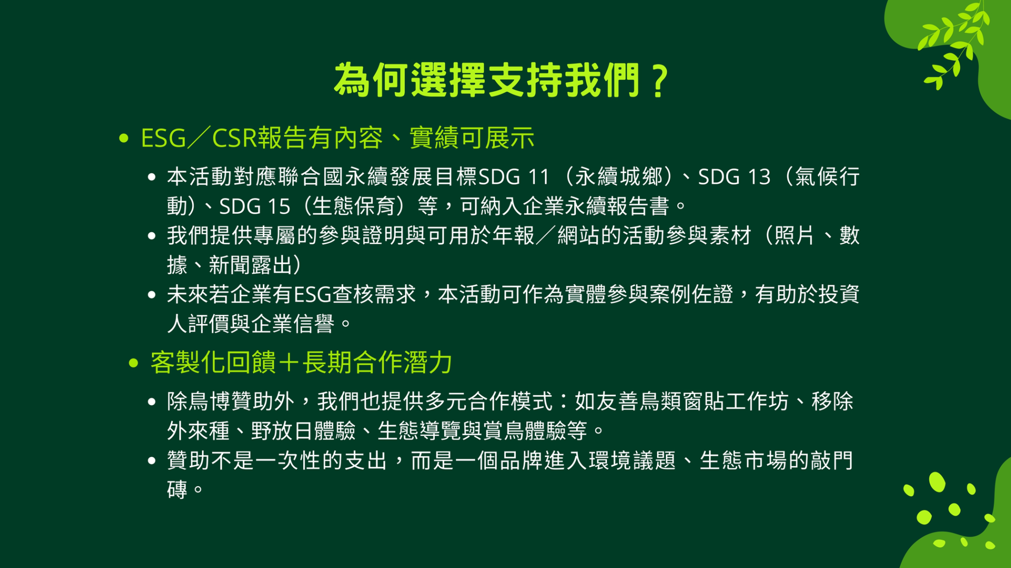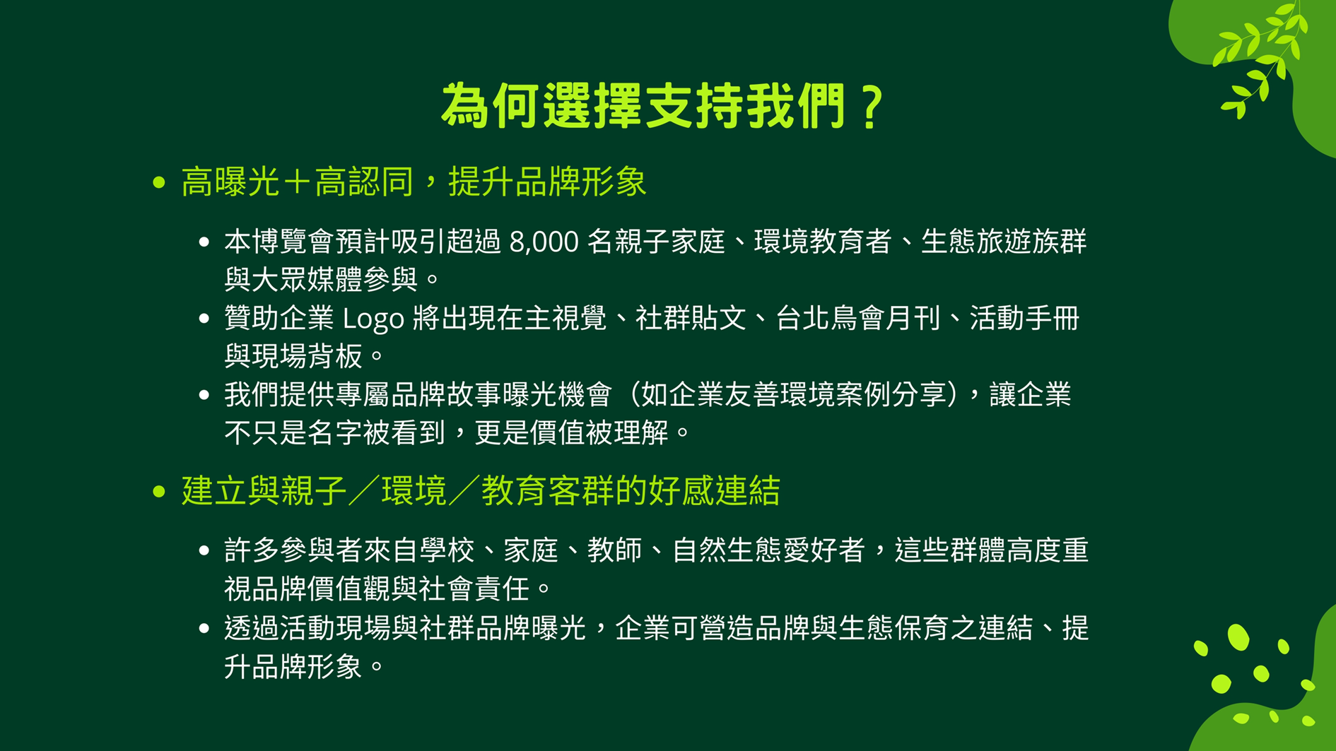 態。活動邀請約15個國外野生動物保育團體及60個國內單位(含野保團體、公民科學團隊、學校等)設攤推廣保育成果,並以闖關活動、專家講座、生態影片播映等推廣環境教育。